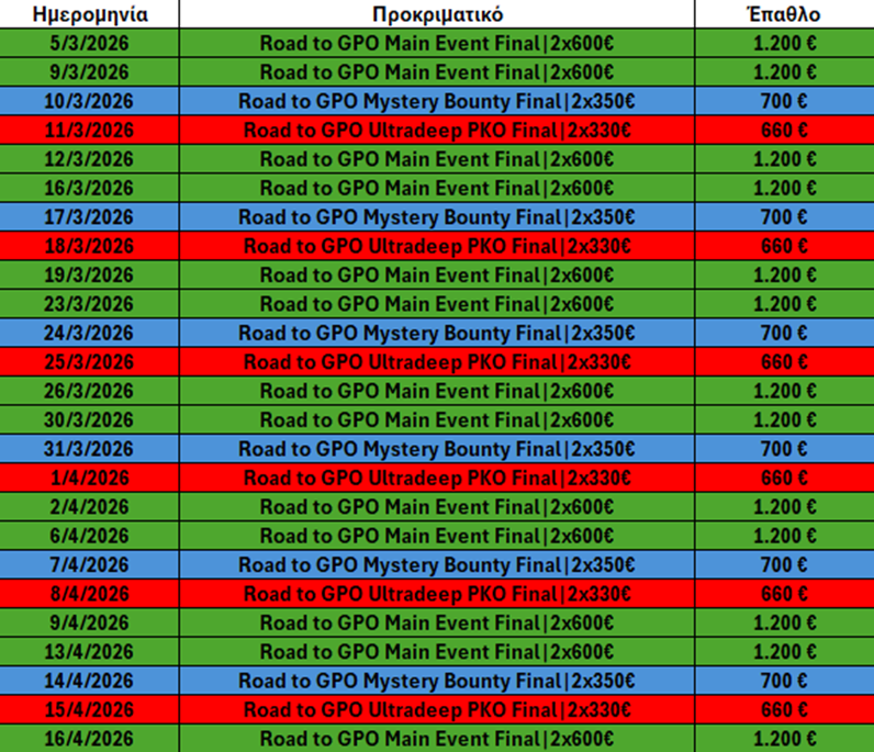 Καθημερινά θα τρέχουν freerolls και steps ξεκινώντας από 0.25€ τα οποία θα οδηγούν στα τελικά προκριματικά.