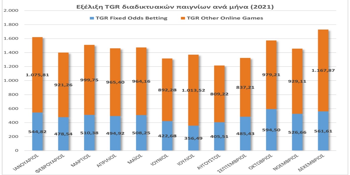 Με βάση πάντα τη εξέλιξη μηνιαίως του κύκλου εργασιών , το έτος 2021 διαπιστώνεται ότι η συμμετοχή στα διαδικτυακά τυχερά παίγνια παραμένει σε υψηλό επίπεδο τους μήνες Σεπτέμβριο έως και Μάιο σε σχέση με τους καλοκαιρινούς μήνες όπου και παρουσιάζεται σημαντική πτώση.